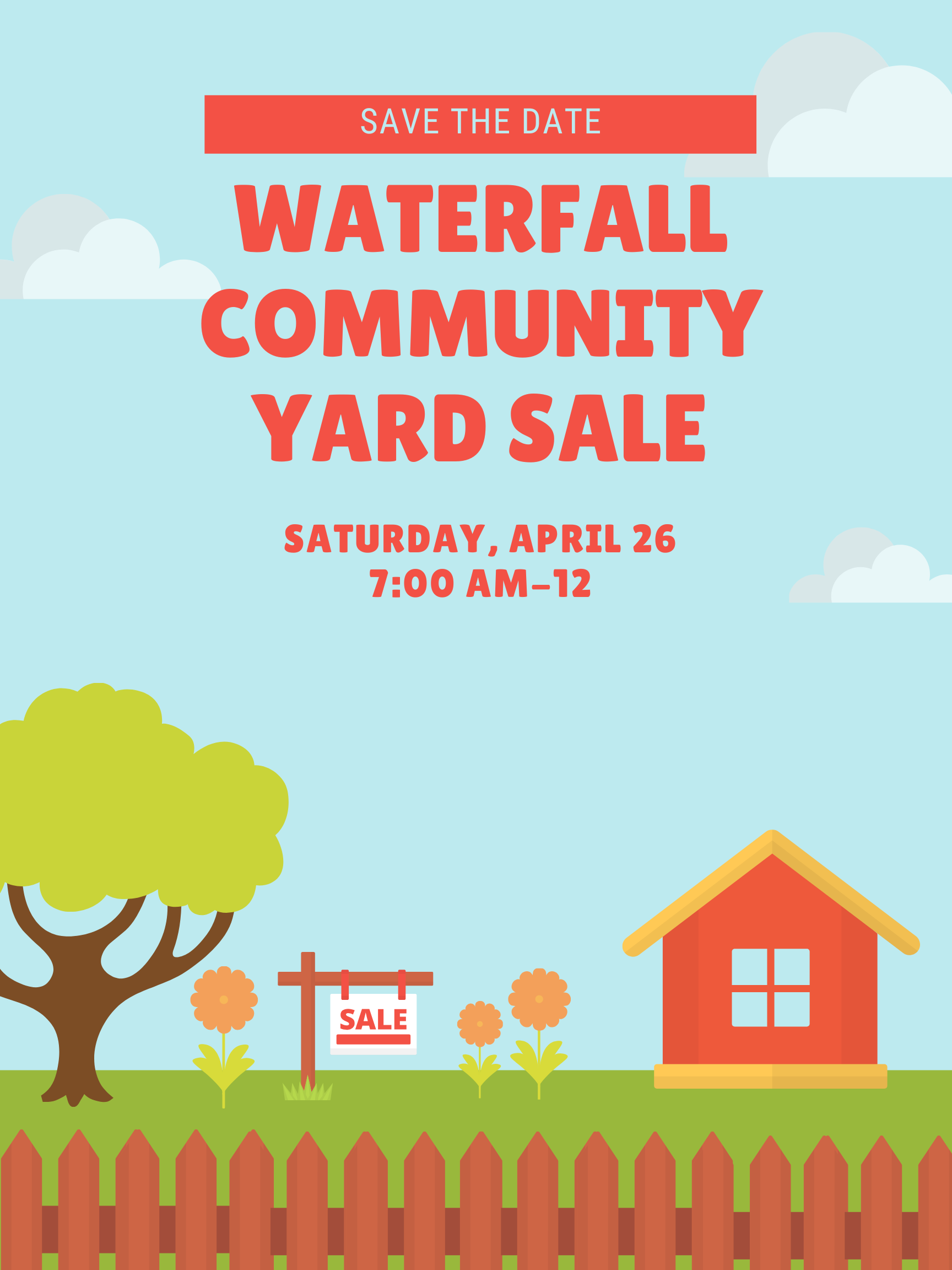 Community Yard Sale Save the date for the Waterfall Community Yard Sale on Saturday, April 26 from 7AM-Noon. Share this:Share Share on Facebook (Opens in new window) Facebook Share on X (Opens in new window) X Email a link to a friend (Opens in new window) Email Like Loading... Leave a comment Cancel reply Δ