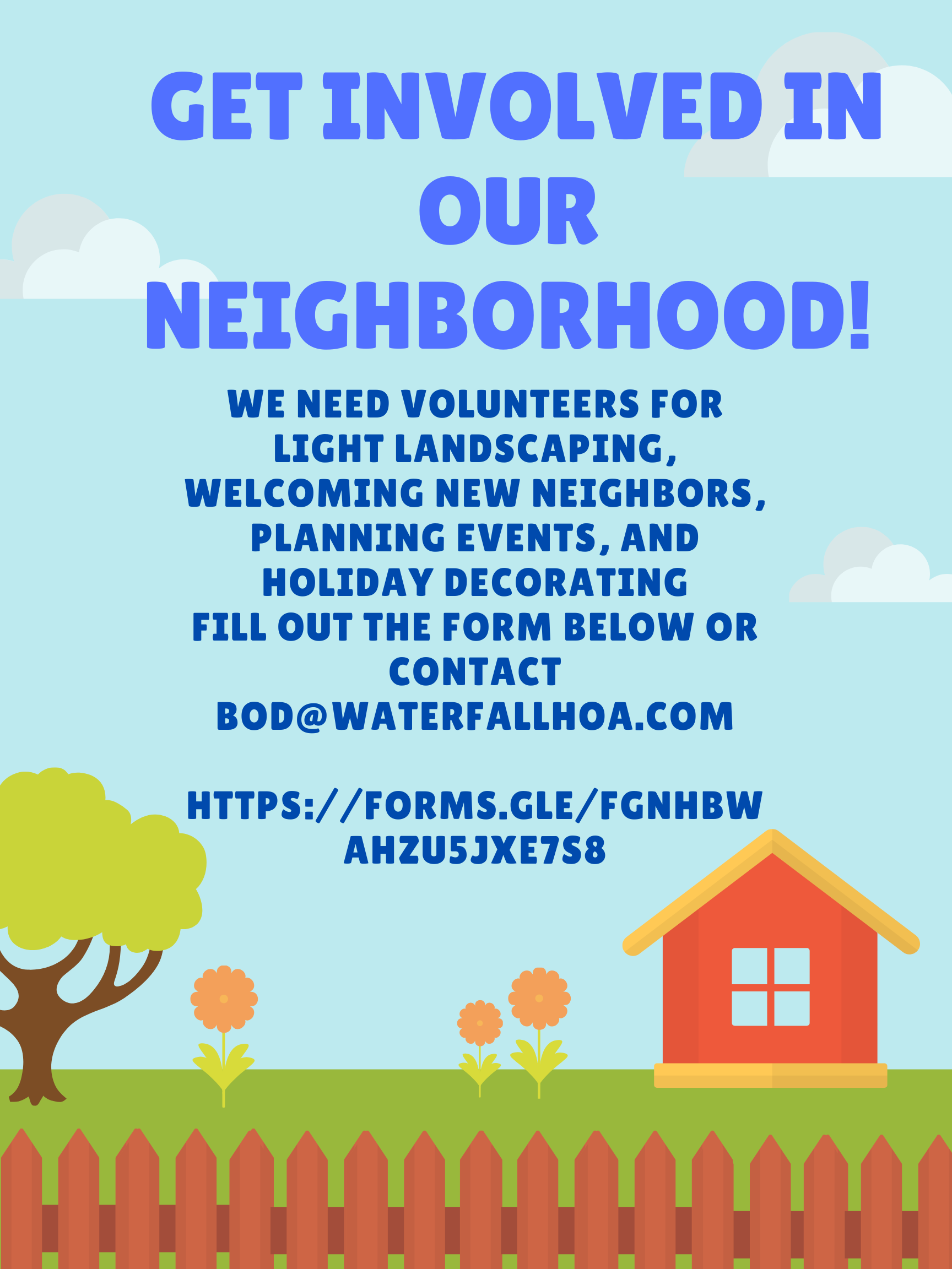 Please fill out the form below if you are interested in helping! If you have any questions, please reach out to bod@waterfallhoa.com.